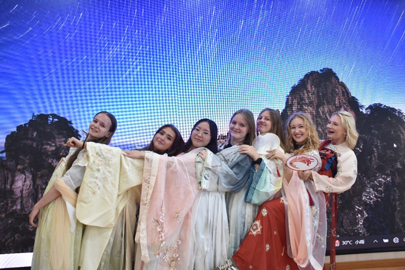 在随后的汉服体验环节中,丹麦学生兴致勃勃地穿上汉服,在镜头前留下珍贵瞬间,完成第一次汉服体验的文化初遇。