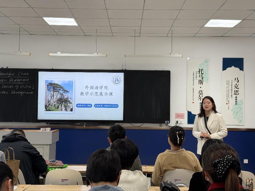 11月12日下午,外国语学院在5201智慧教室举办示范课教学观摩活动。外国语学院教师周渊以“用英语讲好中国绿色发展的故事”为主题,呈现了一堂融合AI赋能、思政引领及成果导向的大学英语创新示范课。观摩活动由副院长周东彪主持,学院领导及全体教师参加观摩活动。