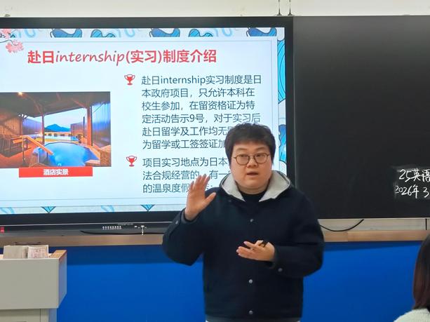 为拓宽学生国际视野,深化产教融合,助力学子规划海外实践路径,3月25日下午3时,我院在逸夫综合楼5201教室举办赴日带薪实习项目专题讲座。本次讲座由李艳老师主持,特邀合肥通商信息科技有限公司吴学勤担任主讲人,吸引了众多对国际交流与海外实习感兴趣的同学到场聆听。