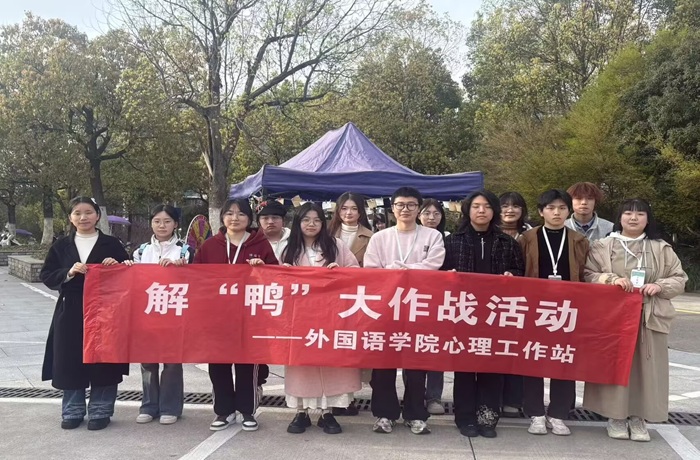为帮助学生缓解心理压力、营造积极健康的校园氛围,3月25日下午,外国语学院心理工作站在逸夫综合楼门口举办第三期解“鸭”大作战心理健康主题活动。本次活动是自2023年以来,解“鸭”系列特色活动的第三期,活动以趣味寻宝为核心形式,切实聚焦学生心理健康关怀,为春日校园增添了蓬勃朝气与活力。